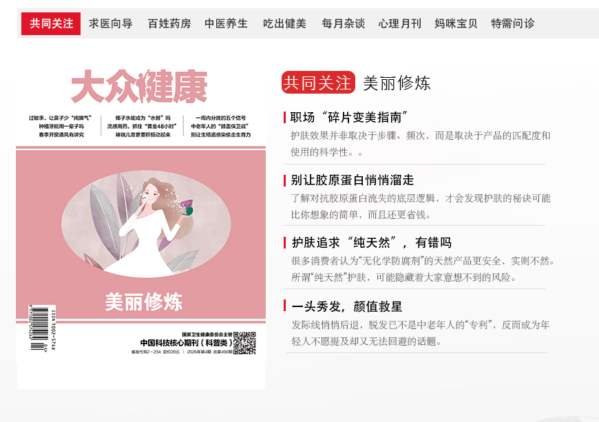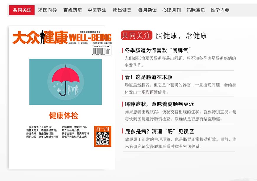 《大众健康》杂志是一本全国性卫生科普月刊。内容科学、权威、有趣。以讲述最真实的人体、最有趣的医学、最健康的生活为办刊主旨,是一本适合全家阅读的家庭医学杂志。